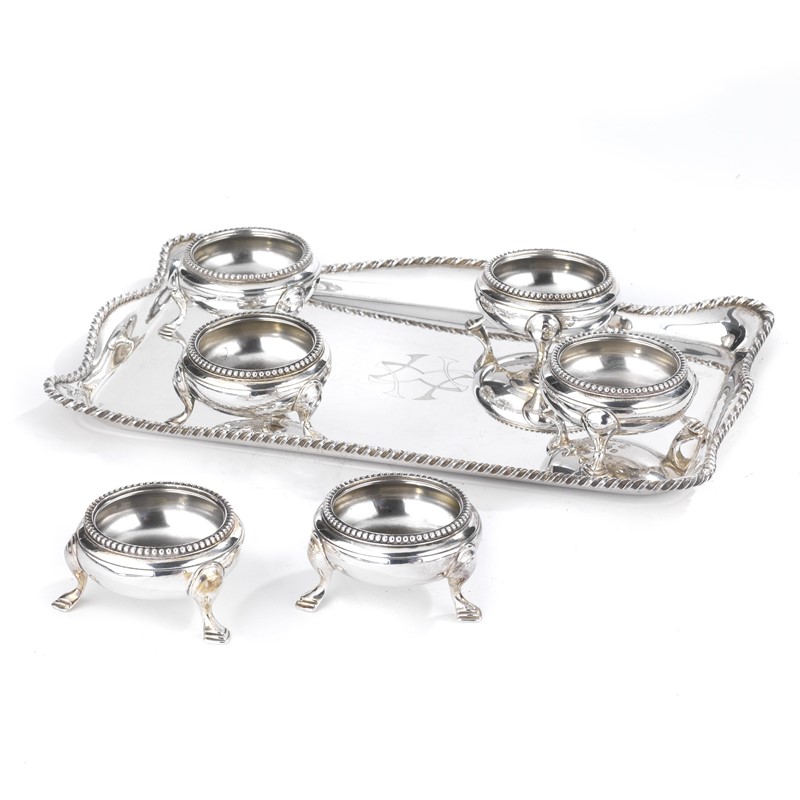 SIX SILVER SALT CELLAR, BIRMINGHAM, 1898, MARK OF ELKINGTION & Co Ltd WITH A LITTLE SILVER TRAY, 20TH CENTURY