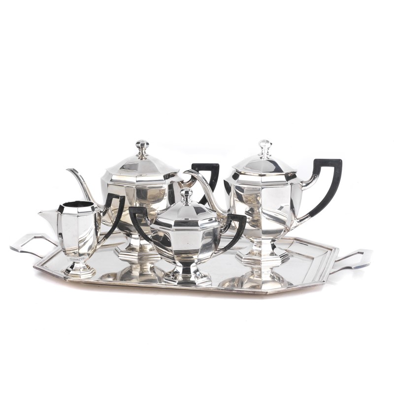 in argento composto di due teiere, una zuccheriera, una lattiera e un guantiera, complessivi g 4235. Guantiera cm 63x36