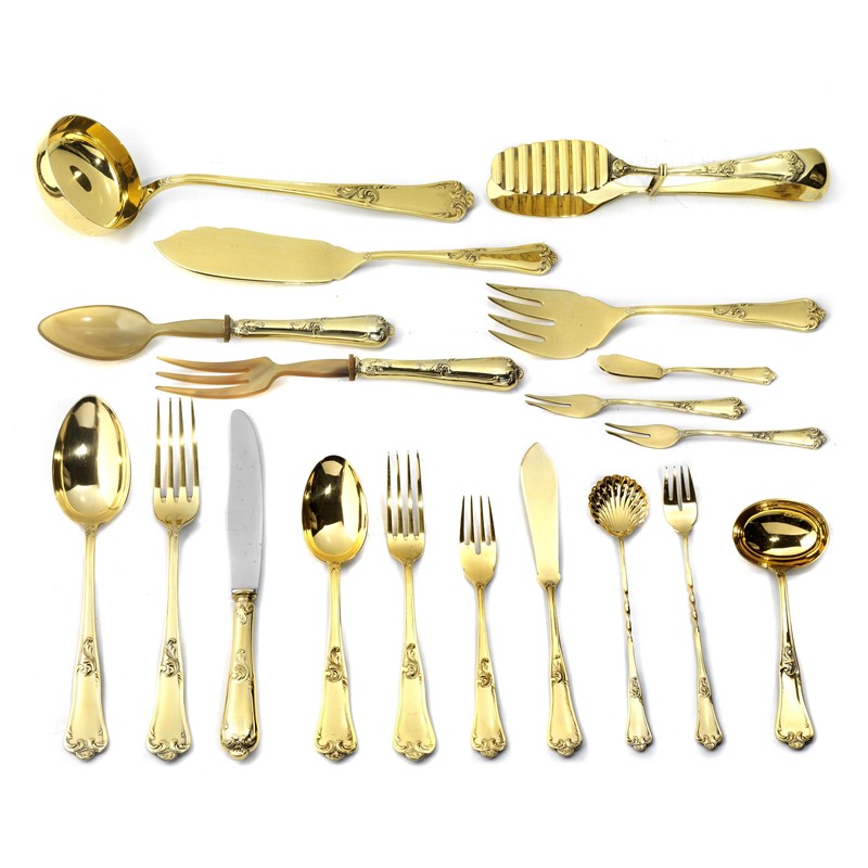 in argento dorato, manici con finali sagomati decorati da volute, composto di centocinquantuno pezzi, complessivi g 7810 (151)
