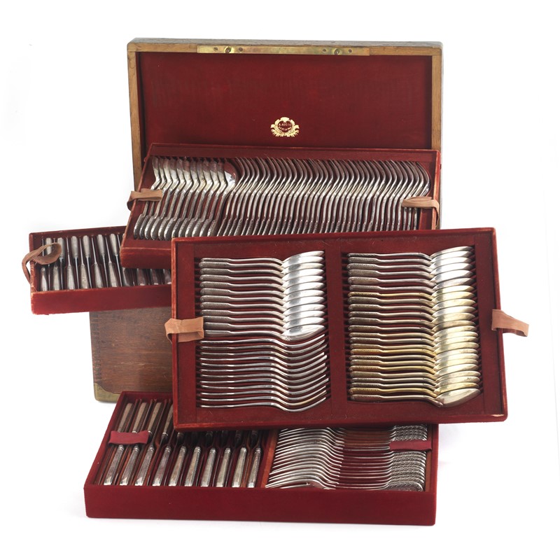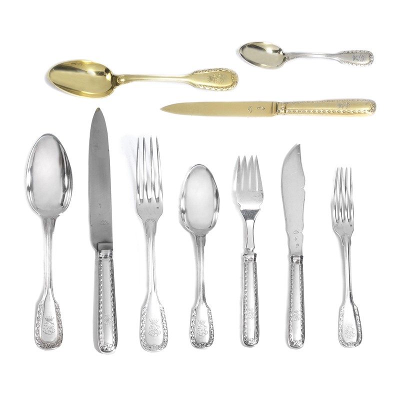 Composizione: 60 forchette; 18 cucchiai; 48 coltelli; 18 forchette da pesce e 18 coltelli da pesce; 18 cucchiai da frutta in argento e 18 cucchiai da frutta in argento dorato; 18 forchette da frutta; 18 forchette da frutta in argento dorato; 12 cucchiai da tè in argento dorato; 12 coltellini in argento e argento dorato