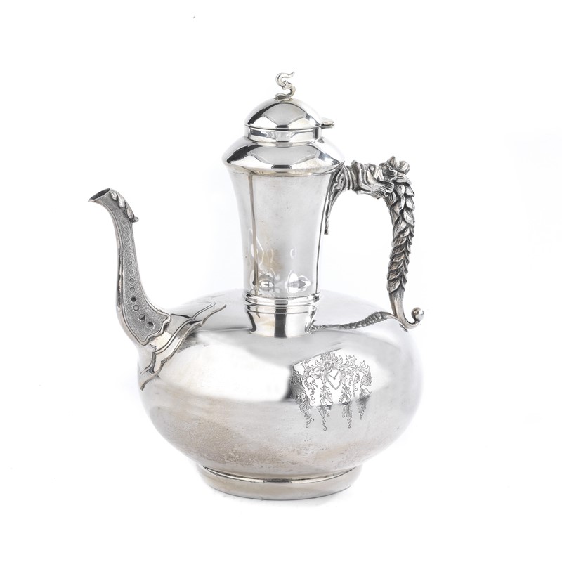 in argento, corpo sferico decorato da festoni di foglie incise, alto collo, beccuccio sagomato, presa a tralcio di foglie e finale del coperchio in forma di serpente, alt. cm 26, g 830