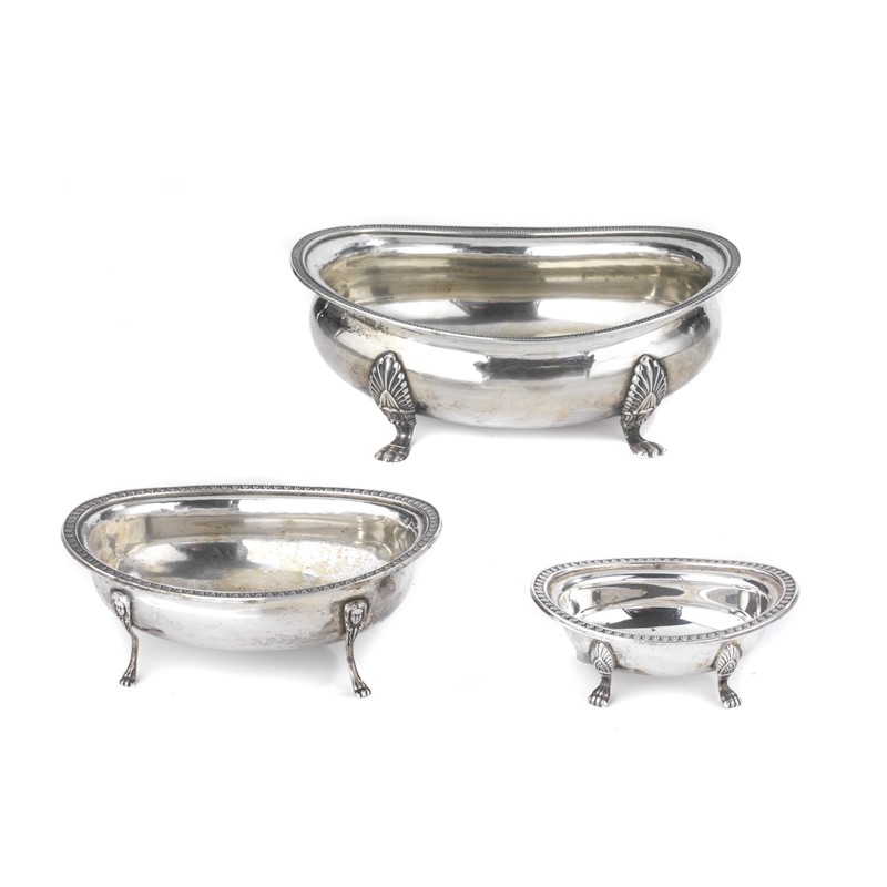 in argento di forma ovale con bordo decorato da foglie lanceolate, ciascuna poggiante su quattro piedini terminanti a zampa ferina, cm 9,5x7,5; 14,5x11 e cm 21x16, complessivi g 560