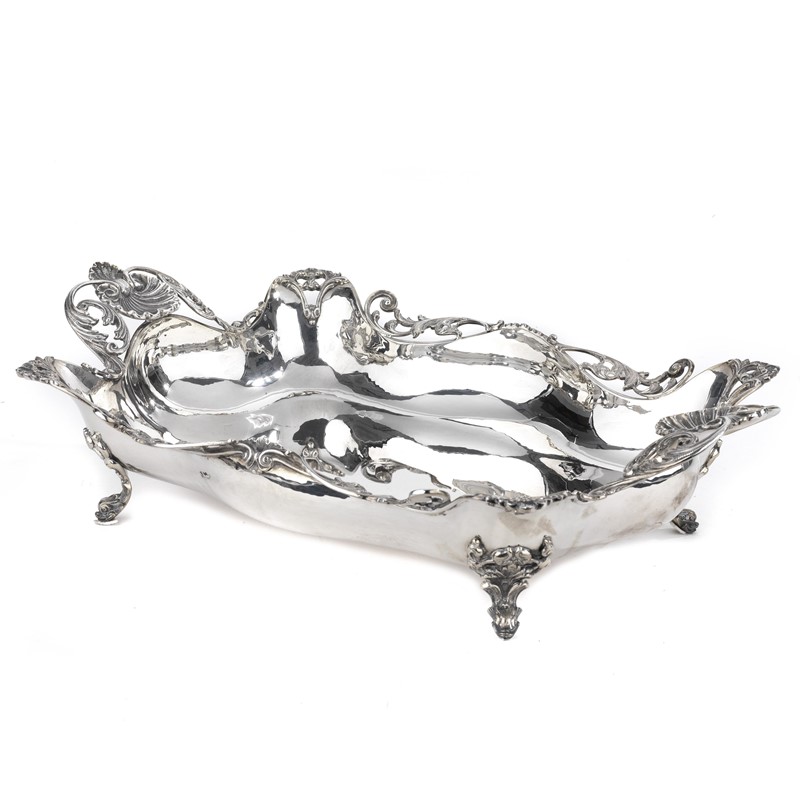 in argento di forma rettangolare sagomata,profilo a volute di foglie, due anse a conchiglia, quattro piedini in forma di animali marini, cm 47,5x28, g 1790