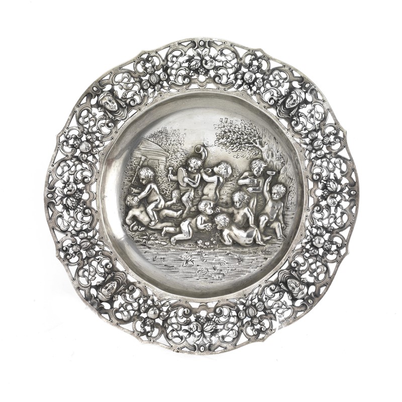 in argento di forma circolare con ampia tesa traforata, cavetto decorato da putti giocosi in rilievo, diam. cm 27, g 455