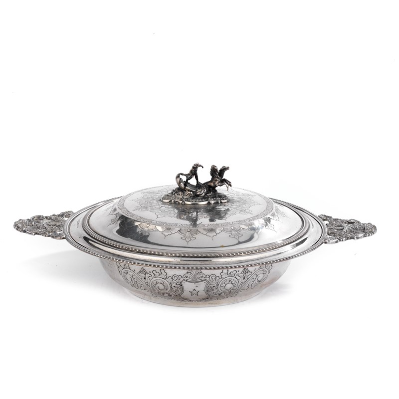 in argento di forma circolare decorata da volute di foglie, anse realizzate come cornucopie, presa del coperchio a tutto tondo, diam. cm 39,5, g 1390