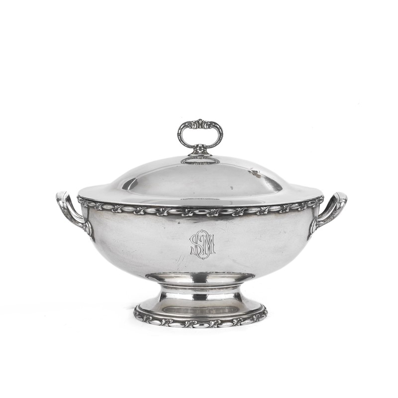 in argento sterling di forma ovale, base e bordo della coppa decorati da festoni di elementi ovali e foglie, due anse e presa del coperchio a doppia voluta, cm 33x20, g 1550
