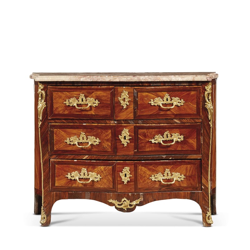lastronata in bois de rose e bois de violette su piano in marmo, di epoca transizione, leggermente mossa sul fronte e sui fianchi, presenta tre cassetti con traverse, e decorazione rocaille che scende in perlinatura fino ai sabots sulle gambe anteriori in bronzo dorato, maniglie e bocchette presentano anch'esse decorazione rocaille, cm 82x96x46