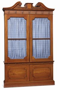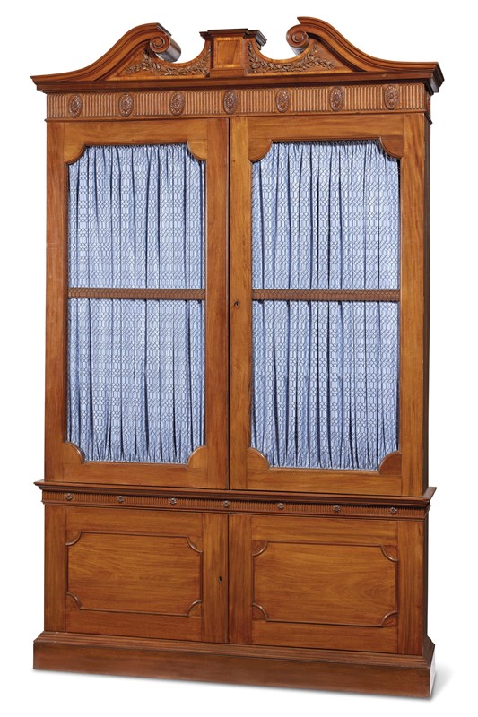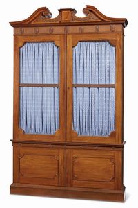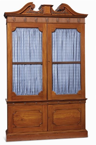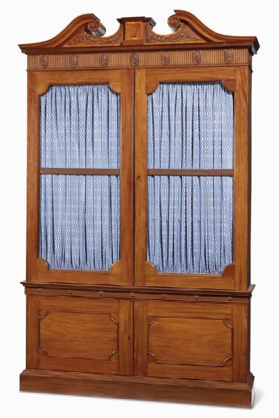 COPPIA DI LIBRERIE A DOPPIO CORPO, INGHILTERRA, SECONDA METÀ SECOLO XVIII in mogano, corpo superiore a due sportelli mistilinei sormontati da fascia intagliata a motivo di scanalatura alternata a fiori a sostenere la cimasa di forma architettonica a doppia voluta decorata da rametti di foglie trattenuti da un nastro, corpo inferiore a due sportelli sformellati all’interno dei quali una delle due presenta sei cassetti appaiati, base modanata; cm 285x177x39