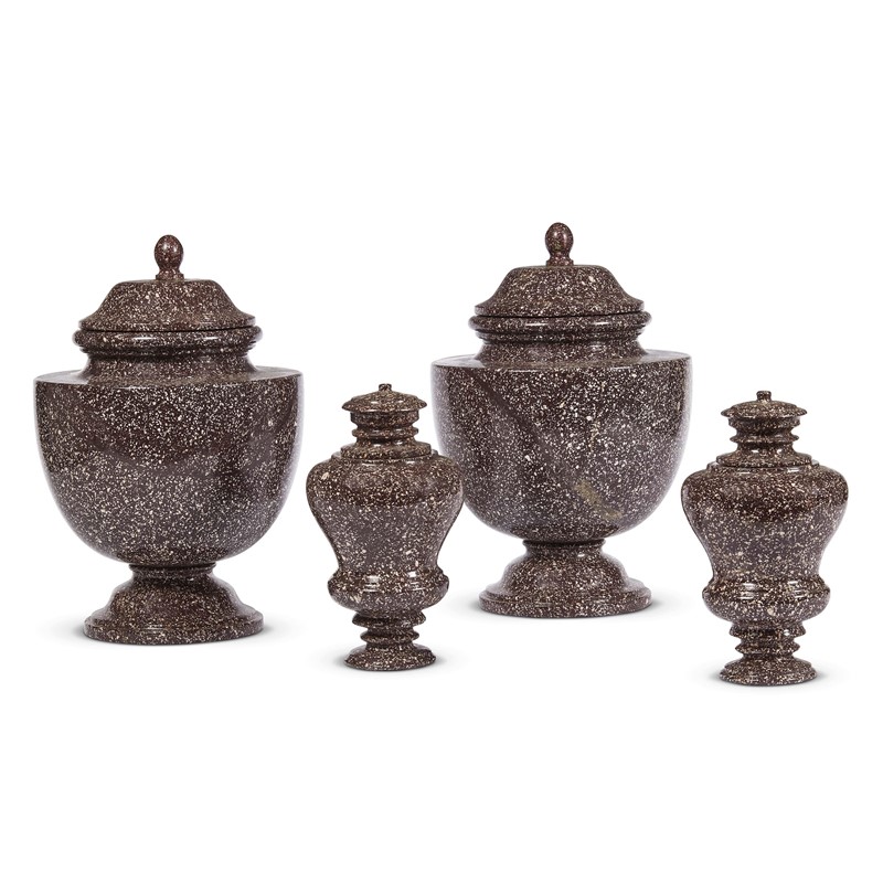 DUE COPPIE DI VASI AD URNA CON COPERCHIO, ROMA, SECOLO XX in porfido rosso, due con coperchio e pancia di forma semisferica che ricade su base con gola ricurva e piede modanato; due con piccolo coperchio che scende su collo tornito e su corpo in forma di balaustro su piede tornito; cm 33x23 e cm 23x12