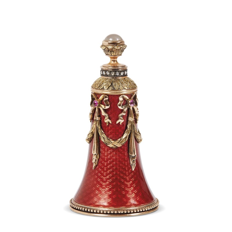 FLACONE DA PROFUMO, RUSSIA, INIZIO SECOLO XX in forma di campanello in oro, argento e metallo dorato con fondo in smalto rosso con applicazioni di festoni e drappi trattenuti da fiocchi centrati da rubini cabochon, sormontato da fascia con diamanti a rosette, tappo con pietra di luna; reca i bolli spuri dell’orafo Henrik Wigström (1862-1923); completo di astuccio; alt. cm 7