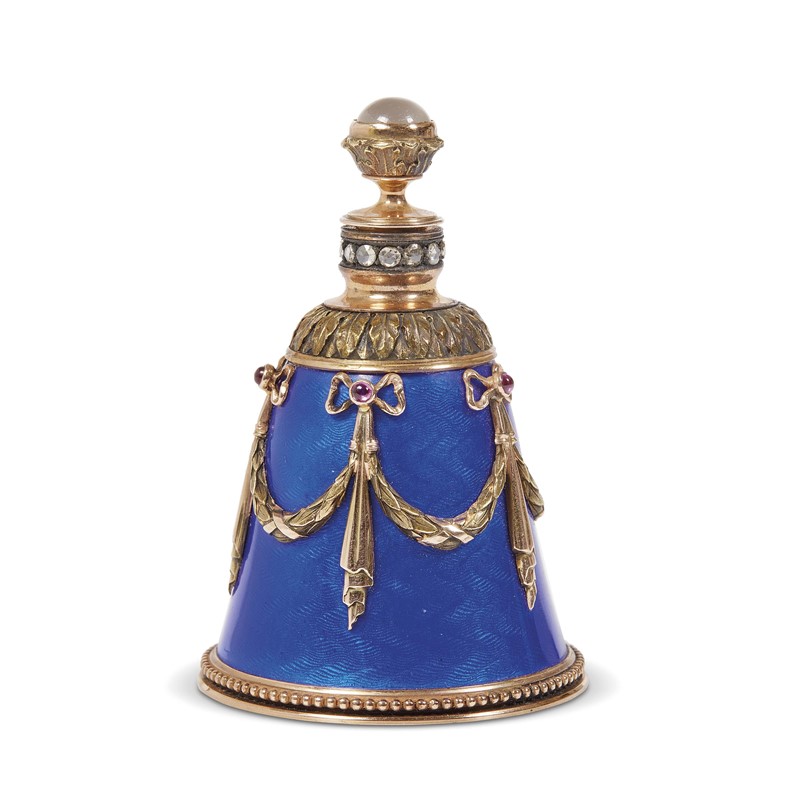 in forma di campanello in oro, argento e metallo dorato con fondo in smalto blu con applicazioni di festoni e drappi trattenuti da fiocchi centrati da rubini cabochon, collo sormontato da fascia con diamanti a rosette, tappo con pietra di luna, base con perlinature; completo di astuccio, alt. cm 6,2