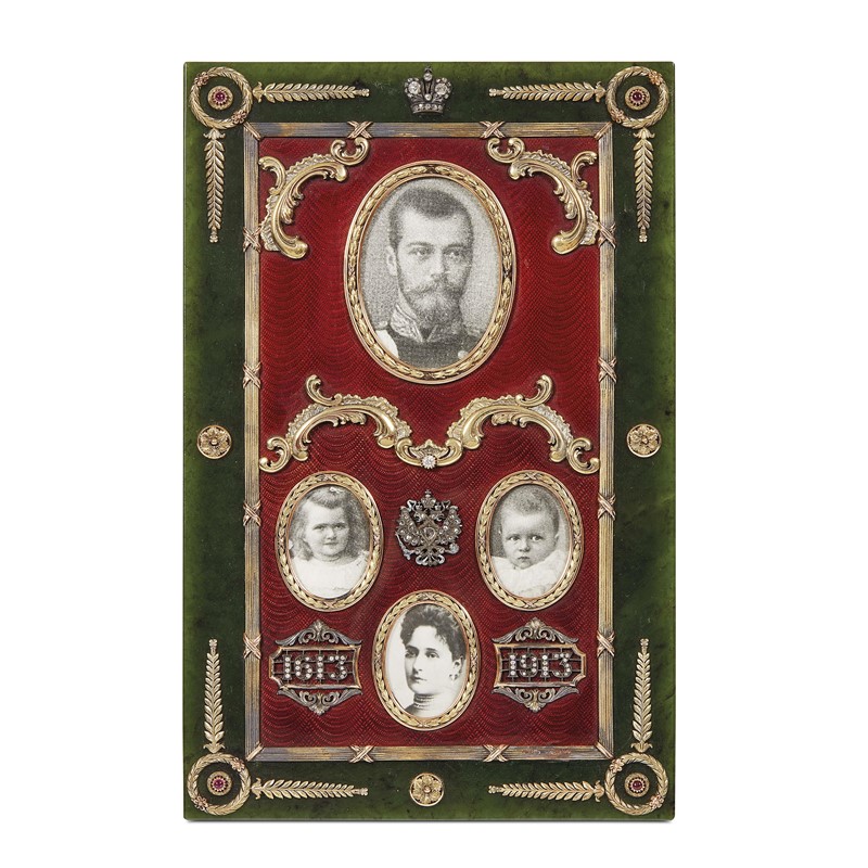 GRANDE CORNICE, RUSSIA, INIZIO SECOLO XX in nefrite e smalto rosso, applicazioni oro e metallo dorato, rubini angolari, quattro luci ovali di cui la principale sormontata da corona in diamanti come l’insegna della Casa Imperiale russa al centro e le due date 1613 e 1913 nella parte inferiore; reca bolli spuri dell’orafo Michael Perchin (1860-1903); cm 22x14