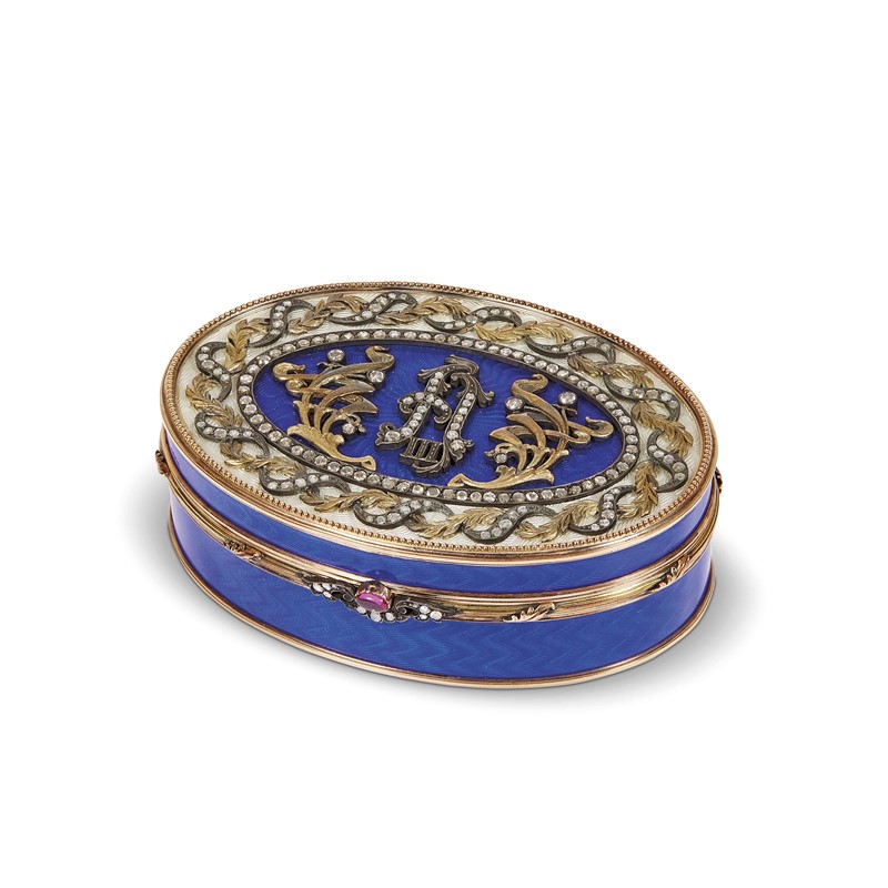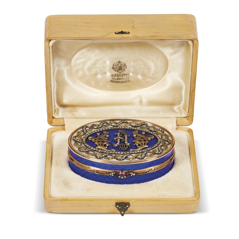 in oro, argento, metallo dorato e smalto blu, coperchio con riserva ovale contornata da diamanti a rosette che si ritrovano sul monogramma dello Zar Alessandro III, chiusura con rubino cabochon; completa di astuccio; cm 2,8x8,5x5,9