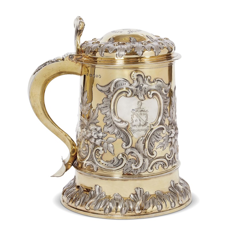in argento e argento dorato, di forma cilindrica con base decorata da foglie, racemi, fiori e volute incorniciano, sul fronte, una riserva sagomata con stemma araldico inciso, sul retro, una riserva con iscrizione WON BY BOB CHAMBERS THE PROPERTY OF BENJAMIN BIGGEE DECKHAM HALL CATESHEAD.". Il coperchio a cupola presenta altra iscrizione incisa LIVERPOOL STAMFORD TANKARD 1866; alt. cm 35, g 2030