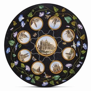 TAVOLO, TOSCANA, SECONDA METÀ SECOLO XIX in marmi vari, il piano di forma circolare lavorato in scagliola [..]