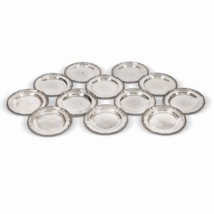 DODICI PIATTI, ARGENTIERE JOHN HARVEY I, LONDRA, 1766 in argento di forma circolare con tesa sagomata e profilata [..]