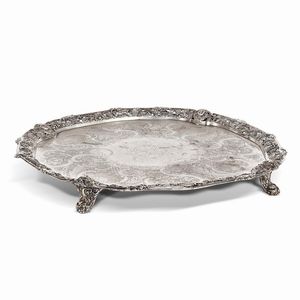 VASSOIO, LONDRA, 1750 in argento, il piano interamente cesellato a girali e motivi floreali che circondano stemma [..]