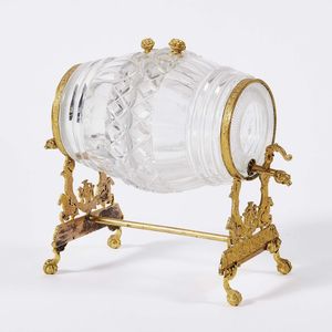 PORTALIQUORI, FRANCIA, SECOLO XIX in foggia di botte in cristallo tagliato su supporti in metallo dorato con decori [..]
