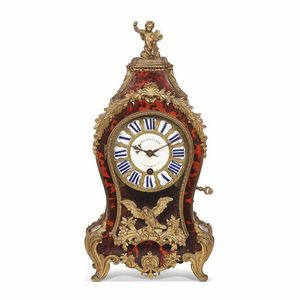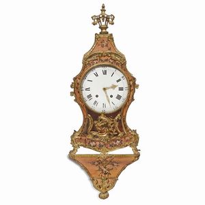 OROLOGIO CARTEL, FRANCIA, SECOLO XVIII interamente lastronato e sormontato da figura di putto, è impreziosito [..]