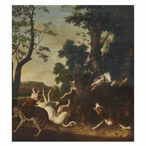 Scuola inglese, fine secolo XVIII-inizio secolo XIX GRANDE SCENA DI CACCIA raffigurante dei cani che lottano con [..]