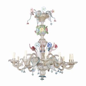 LAMPADARIO, MURANO, INIZIO SECOLO XX in vetro policromo sui toni del rosa e turchese, apice di forma svasata decorato [..]