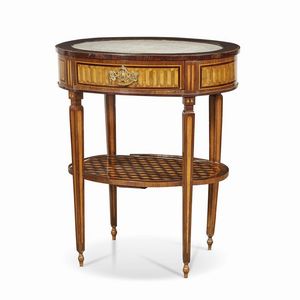 TAVOLINO DA CENTRO, FRANCIA, SECONDA METÀ DEL SECOLO XVIII di forma ovale, lastronato in legni da frutto [..]