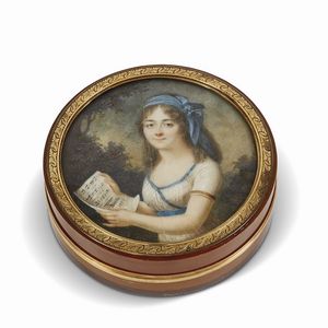 TABACCHIERA, FRANCIA, INIZIO SECOLO XIX in oro parzialmente smaltato, con miniatura dipinta sul coperchio raffigurante [..]