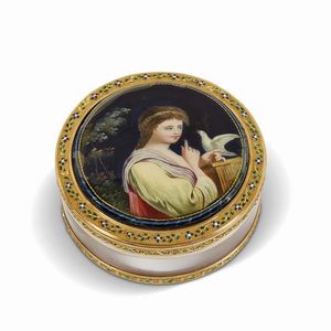 TABACCHIERA, SVIZZERA, INIZIO SECOLO XIX in oro, decorata in smalti, con miniatura sul coperchio rappresentante [..]