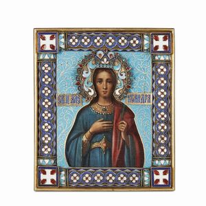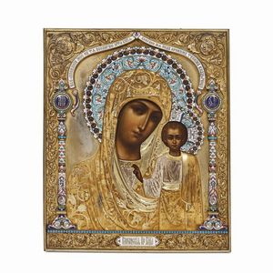 ICONA, MOSCA, 1908-1917 olio su tavola, raffigurante la Vergine Madre di Kazan con il Bambino entro riza in metallo [..]