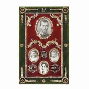GRANDE CORNICE, RUSSIA, INIZIO SECOLO XX in nefrite e smalto rosso, applicazioni oro e metallo dorato, rubini [..]