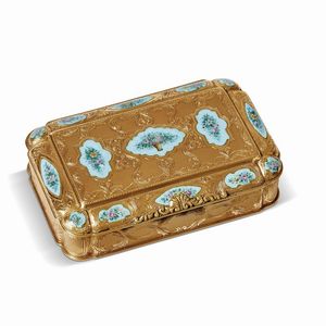 TABACCHIERA, FRANCIA, FINE SECOLO XIX in oro e metallo dorato, con riserve in smalto turchese a soggetto floreale, [..]