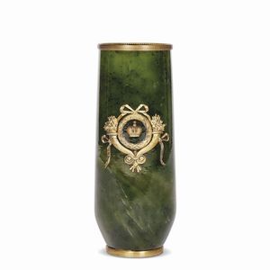 VASETTO, RUSSIA, INIZIO SECOLO XX in nefrite con applicazioni in metallo dorato con cornucopie ricolme di fiori [..]
