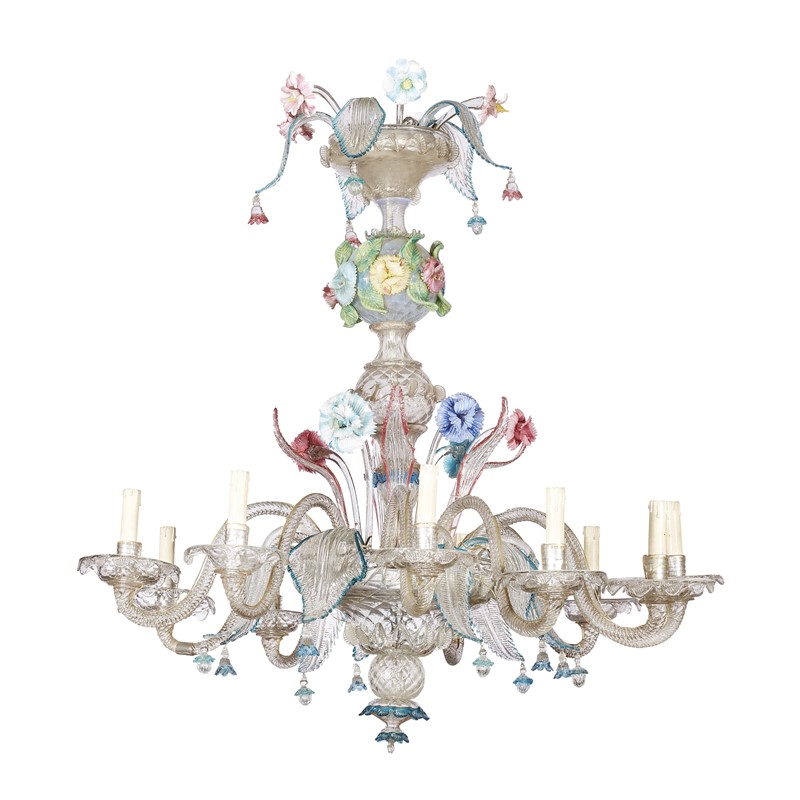 LAMPADARIO, MURANO, INIZIO SECOLO XX in vetro policromo sui toni del rosa e turchese, apice di forma svasata decorato con fiori e foglie terminanti in campanule, si sviluppa in fusto composto da due elementi globulari, uno dei quali decorato da fiori policromi e foglie, termina in grande palco dal quale si dipartono dieci bracci a doppia voluta e vari elementi floreali e fogliacei terminanti in campanule; montato ad elettricità, cm 100x92