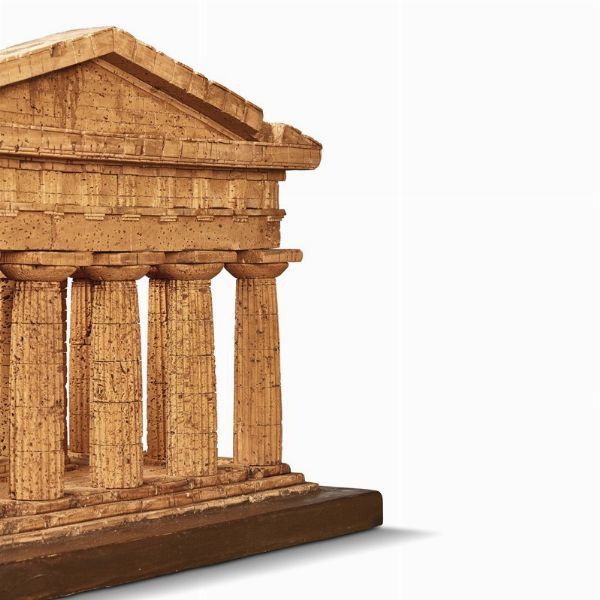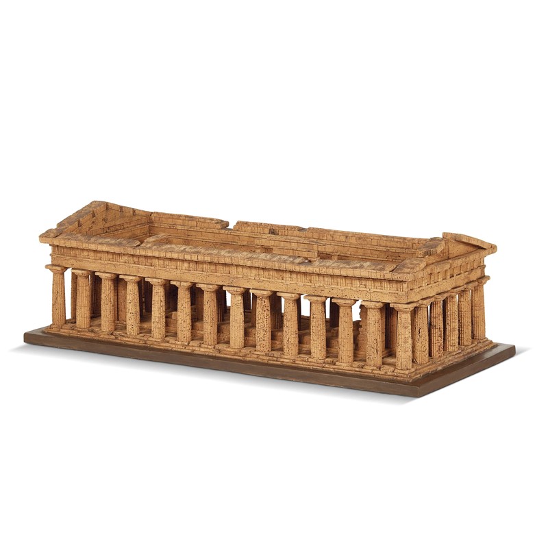 Il presente lotto consta di un intricato modello in sughero del Tempio di Poseidone a Paestum, una delle principali città greche sulla costa del Mar Tirreno, in quella che allora costituiva la cosiddetta “Magna Grecia”. Questo modello replica le fattezze del secondo Tempio di Hera, che fu costruito intorno al 460–450 a.C., ma che era stato assegnato come tempio dedicato a Poseidone. A partire dalla fine degli anni ‘60 del Settecento, i modelli in sughero dei monumenti classici in Italia furono acquistati da ricchi collezionisti britannici durante il loro Grand Tour. Inizialmente commissionati da turisti con specifici interessi antiquari e architettonici, i modelli erano espressione della conoscenza dei colti viaggiatori e della loro “sensibilità neoclassica”. I modelli apparvero presto alla Society of Antiquaries of London e al British Museum, nelle mostre private di Charles Townley e John Stuart, Conte di Bute, e nella collezione reale di Giorgio III. All’inizio dell’800, l’architetto John Soane iniziò ad acquistare modelli dal mercato antiquario per la sua casa museo,oggi una delle più grandi collezioni al mondo.