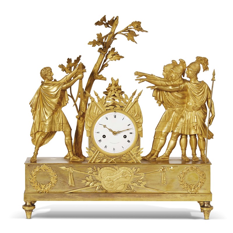 OROLOGIO DA CAMINO, PARIGI, FINE SECOLO XVIII in bronzo dorato, raffigurante il giuramento degli Orazi, la cassa di forma cubica racchiude quadrante firmato CHATELAIN À PARIS ed è affiancata da vessilli e sormontata da braciere ed albero su base rettangolare ornata da corone d alloro e panoplia centrale, cm 53x48,5x12