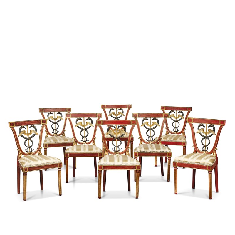 OTTO SEDIE, TOSCANA, SECOLO XIX in legno intagliato e laccato, lo schienale in forma di vaso, impreziosito alle estremità da elementi quadrangolari lumeggiati d’oro e lavorato a giorno con elemento caduceo; seduta in stoffa su fascia longitudinale affiancata da dadi profilati d’oro che sormontano gambe anteriore scanalate rosse e dorate, cm 90x52x42