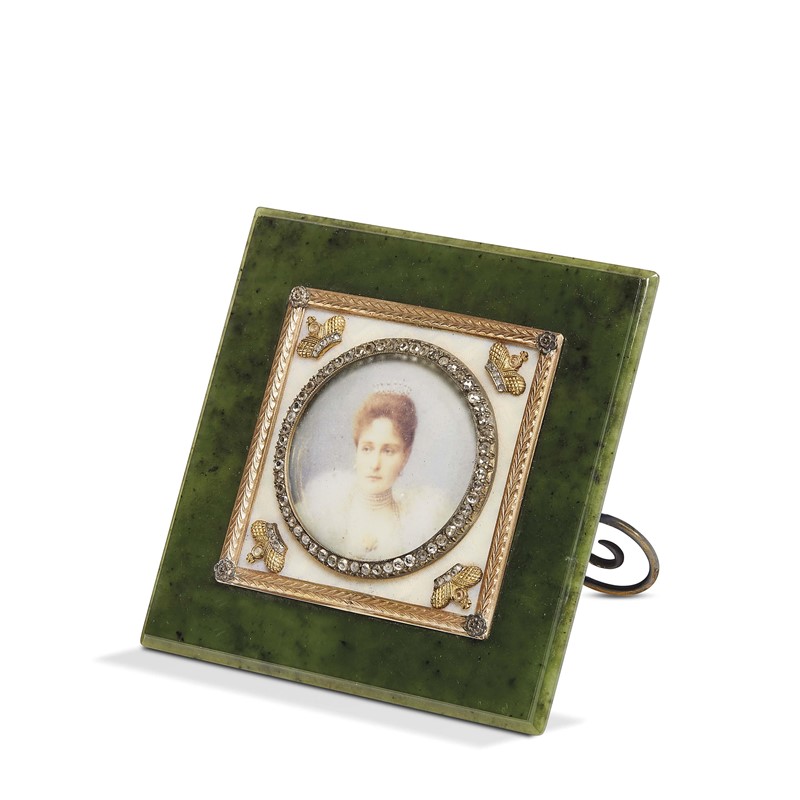 PICCOLA CORNICE, RUSSIA, INIZIO SECOLO XX quadrata in nefrite, oro e argento e metallo dorato con fondo centrale guarnito da cornice in oro e argento con piccole foglie e corone con diamanti a rosette come il contorno della luce circolare; reca i bolli spuri dell’orafo Alfred Thielemann (1883-?); completa di astuccio; cm 9
