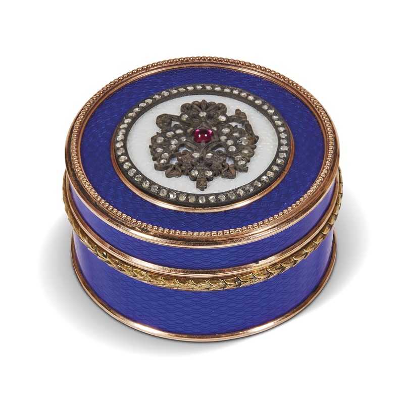 PICCOLA SCATOLA, RUSSIA, INIZIO SECOLO XX in oro e metallo dorato, con fondo in smalto blu centrata da pannello in smalto bianco con guarnizioni raffiguranti le insegne Imperiali in diamanti a rosetta centrate da rubino cabochon; cornice incisa con foglie, cm 2,5x4,8