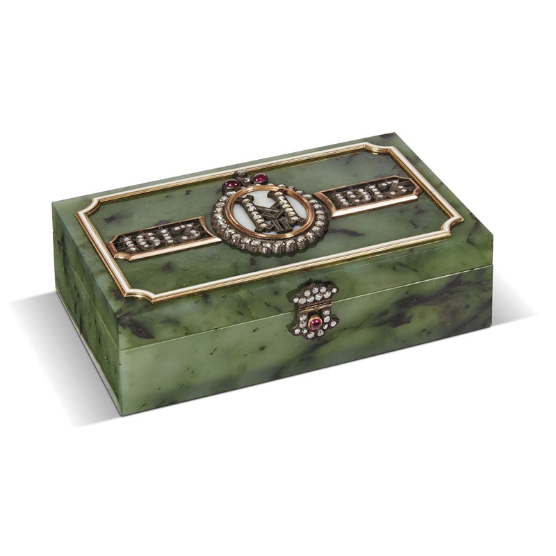 SCATOLA, RUSSIA, INIZIO SECOLO XX coperchio con applicazioni con monogramma con le iniziali dello Zar Nicola II di Russia entro medaglione ovale su fondo in smalto bianco e argento sormontato da due rubini cabochon e le date 1613, 1913 con diamanti a rosette; cm 2,8x9,4x6