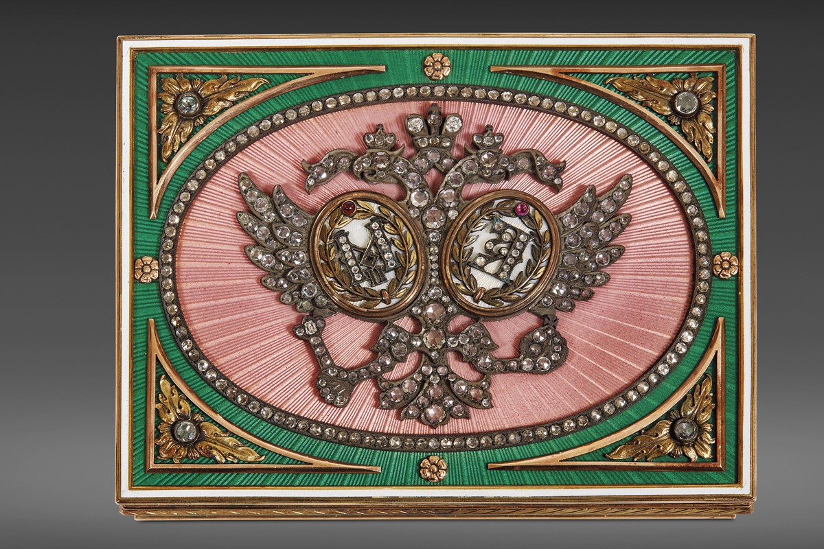 SCATOLA, RUSSIA, INIZIO SECOLO XX in oro, argento, metallo dorato con fondo in smalto traslucido verde. Coperchio con riserva ovale in smalto traslucido rosa contornata da diamanti a rosette decorata da applicazioni di grande aquila bicipite con diamanti a rosette come i due monogrammi Imperiali racchiusi entro medaglioni ovali con le iniziali dello Zar Nicola II sormontati da due rubini cabochon. Agli angoli motivi vegetali centrati da rose cabochon; bolli spuri dell’orafo Michael Perchin (1860-1903); completa di custodia; cm 3,3x10,8x8,2