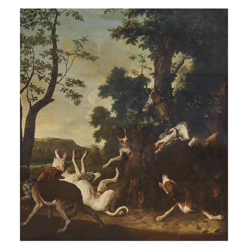English School, late 18th-early 19th century HUNTING SCENE oil on canvas, depicting hounds fighting a boar in the wood; cm 260x230