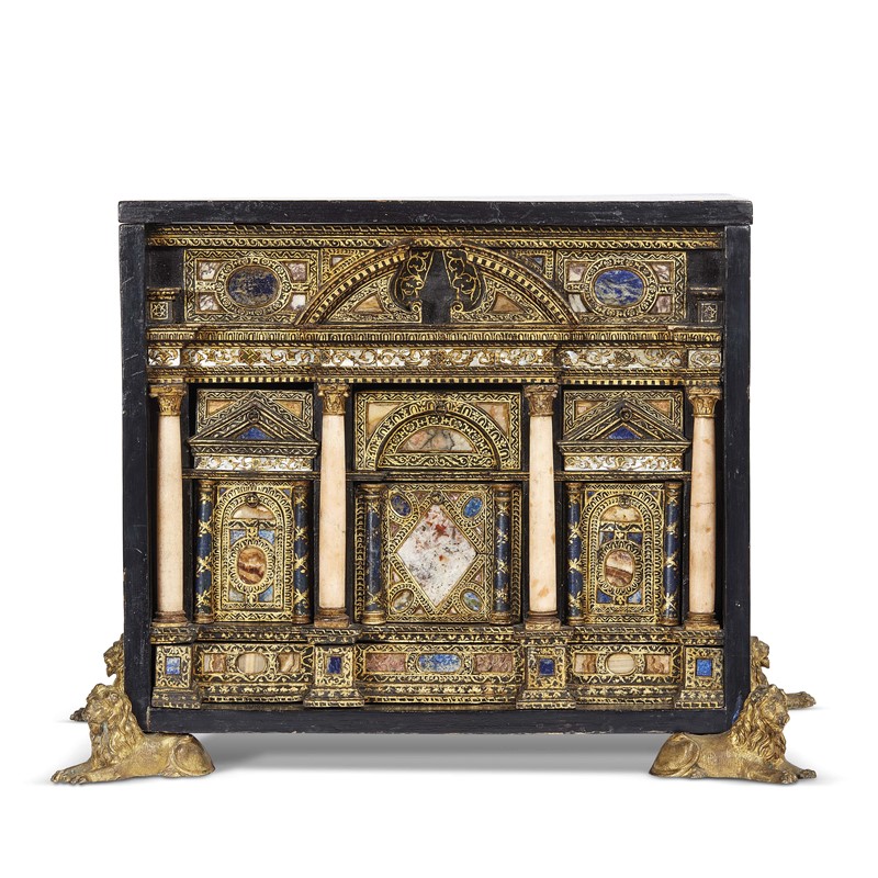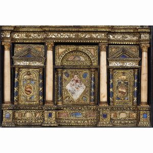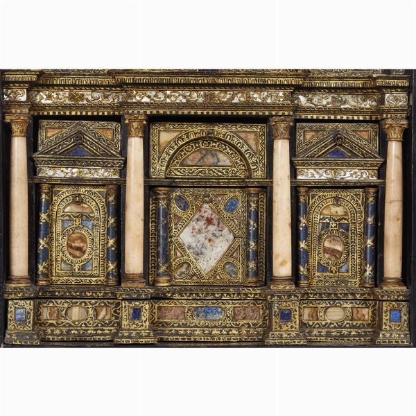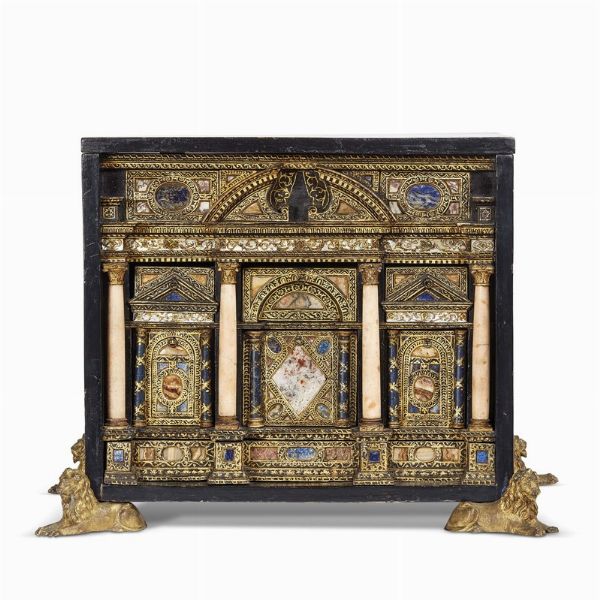 STIPO, VENEZIA, SECOLO XVI in legno scolpito ebanizzato e dipinto in oro, di forma architettonica, presenta quattro colonne sul fronte che scandiscono tre edicole decorati con pietre dure di varie forme e geometriche e dimensioni, ed i cui elementi compositivi sono estraibili tramite piccoli tiretti circolari o elementi architettonici, come per la base la quale si estrae come unico vano; il grande timpano spezzato e gli elementi ad esso adiacenti sono fissi in quanto facenti parte di vano rivelabile alzando il piano superiore dello stipo; poggia su quattro elementi angolari in foggia di leone; le maniglie sono mancanti; cm 45x59x36