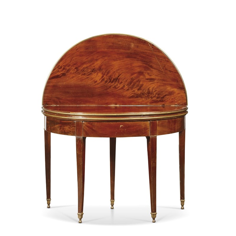 in mogano, a mezzaluna con doppio piano ribaltabile, sotteso da fascia liscia sorretta da gambe troncopiramidali terminanti in sabots in foggia di vaso e piccola sfera, cm 82x109x55,5