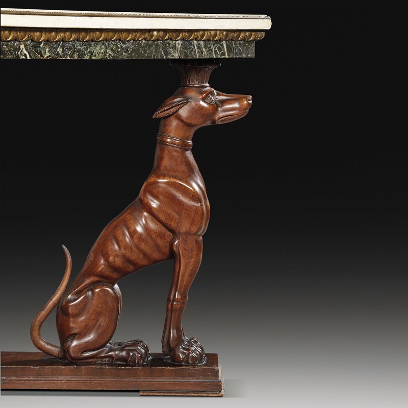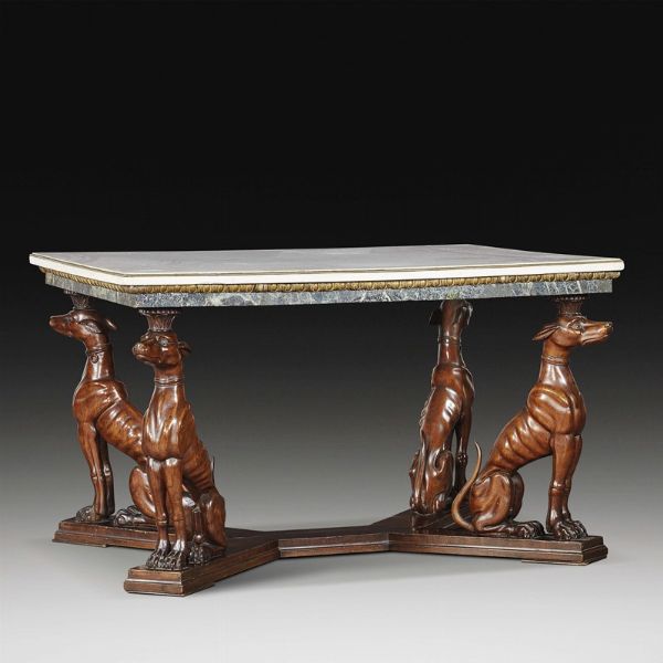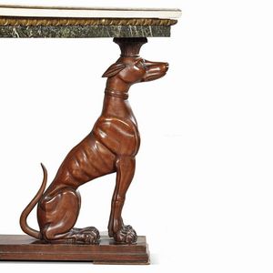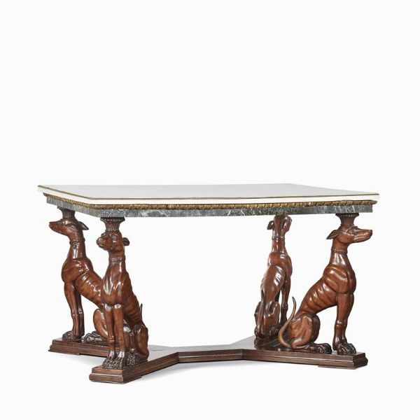 il piano in marmo bianco sotteso da fascia in bronzo dorato lavorata a baccellature e da piano in marmo verde, poggiante su struttura in legno di mogano che presenta quattro gambe lavorate a tutto tondo in foggia di levriero e base sagomata; cm 79,5x 132x102