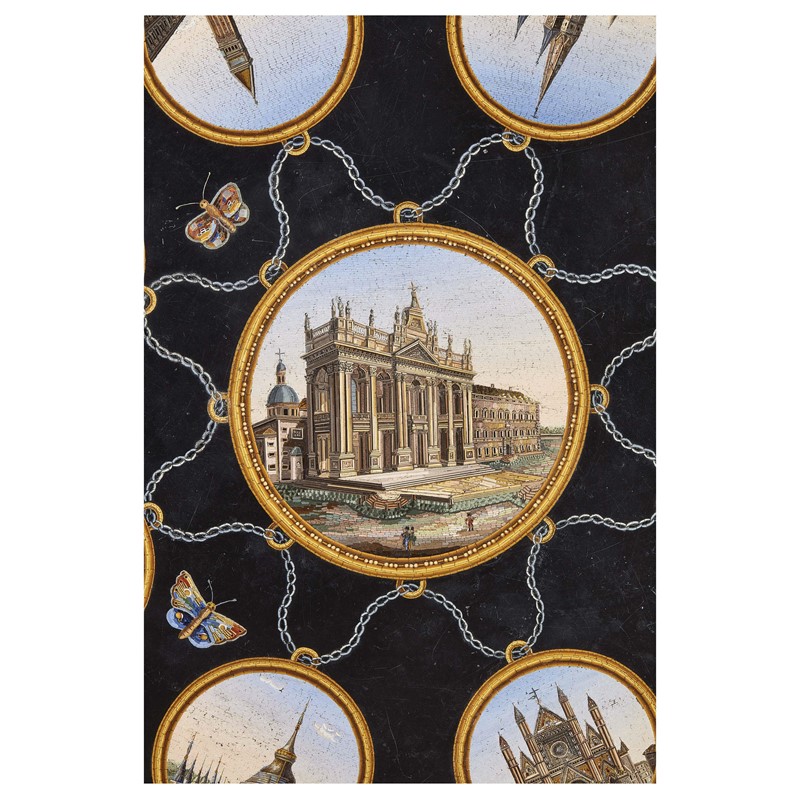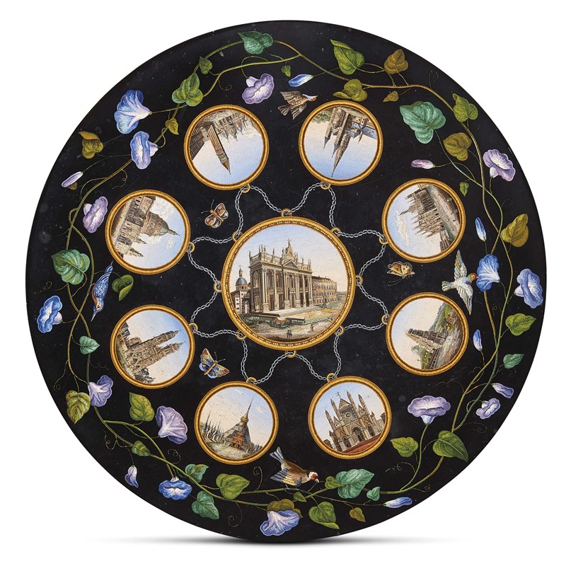 in marmi vari, il piano di forma circolare lavorato in scagliola e micromosaici a motivi di medaglioni e raffigurante la Basilica di San Giovanni in Laterano e altri noti monumenti,in particolare il Duomo di Milano, la Basilica di San Marco, St. Paul Cathedral, il Duomo di Orvieto, la Cattedrale di Tours, le Pagode di Kakku in Birmania, il Tempio di Virupaksha ad Hampi ed il Duomo di Bonn; tali vedute sono contornati da foglie d'edera, fiori uccellini e farfalle; il piano è sotteso da fascia liscia e sostenuto da quattro colonne su base sagomata in marmo; diam. cm 75,5, alt. cm 64
