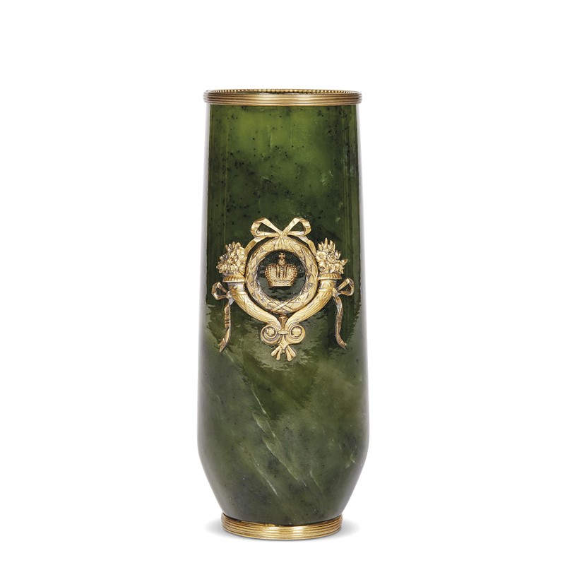 in nefrite con applicazioni in metallo dorato con cornucopie ricolme di fiori e ghirlanda sormontata da fiocco con al centro corona Imperiale, cm 15x5,2