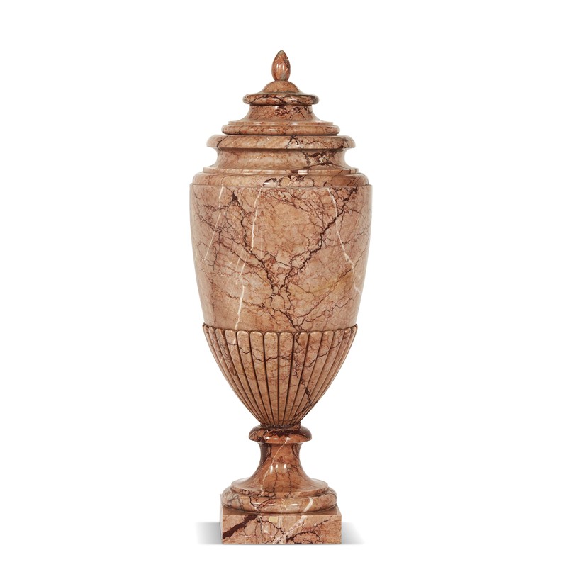 VASO MONUMENTALE, ROMA, PRIMA METÀ DEL SECOLO XIX in marmo Portasanta, presenta fascia circolare liscia sormontata da più ordini di torniture, sulla sezione superiore e decoro lavorato a baccellature in quella inferiore, base di forma tornita su piccolo plinto; alt. cm 105, diam. cm 41