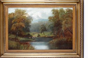 Pittore del XIX-XX secolo Paesaggio lacustre con mucche