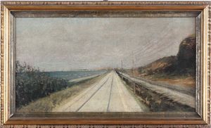 Pittore del XIX-XX secolo Paesaggio costiero con strada