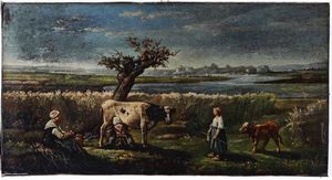 Anonimo del XIX-XX secolo Scena di campagna con mungitura della mucca
